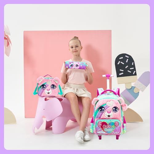 Kids Cute Pink Bear Rolling Backpack with Wheels for Girls School Rolling Backpack Kids Travel Luggage for Girls Ages 5-12