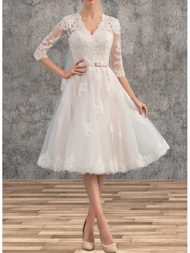 Why Choose Engagement Little White Dresses Wedding Dresses A-Line V Neck 3/4 Length Sleeve Tea Length Satin Bridal Gowns With Sash / Ribbon Appliques?