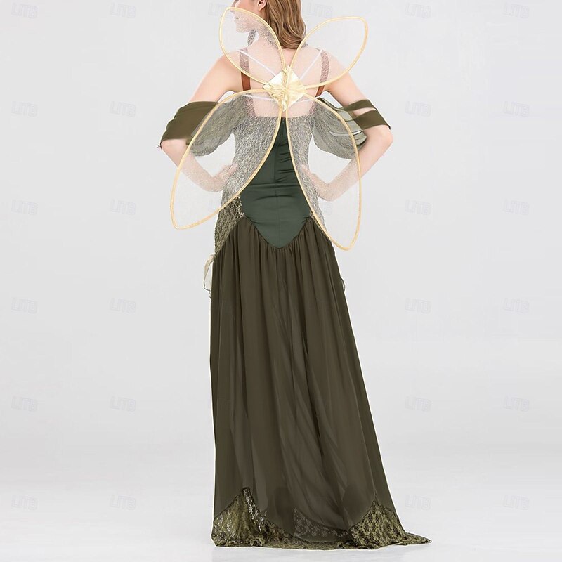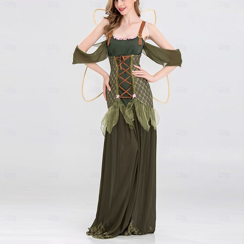 : The costume features a corset-like bodice with intricate lace-up detailing, providing a fitted and structured silhouette that elegantly emphasizes the waist. The long, flowing design enhances the fairy-like charm.